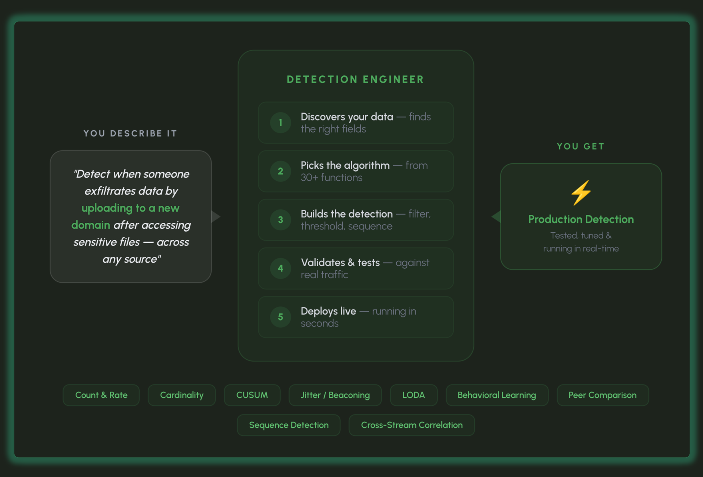 Build production-grade detections in plain English. No YAML. No math degree. No manual tuning.