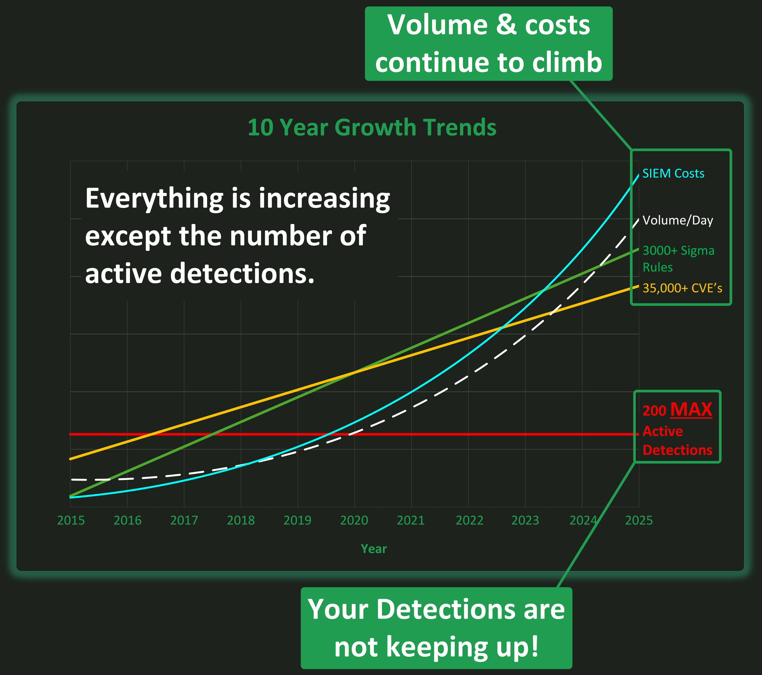 Meanwhile, detection runs on a schedule. Hourly cron jobs. Complex rules choke the system. Most organizations limp along with ~50 rules firing once an hour — not because they don't want more, but because they can't afford the compute.