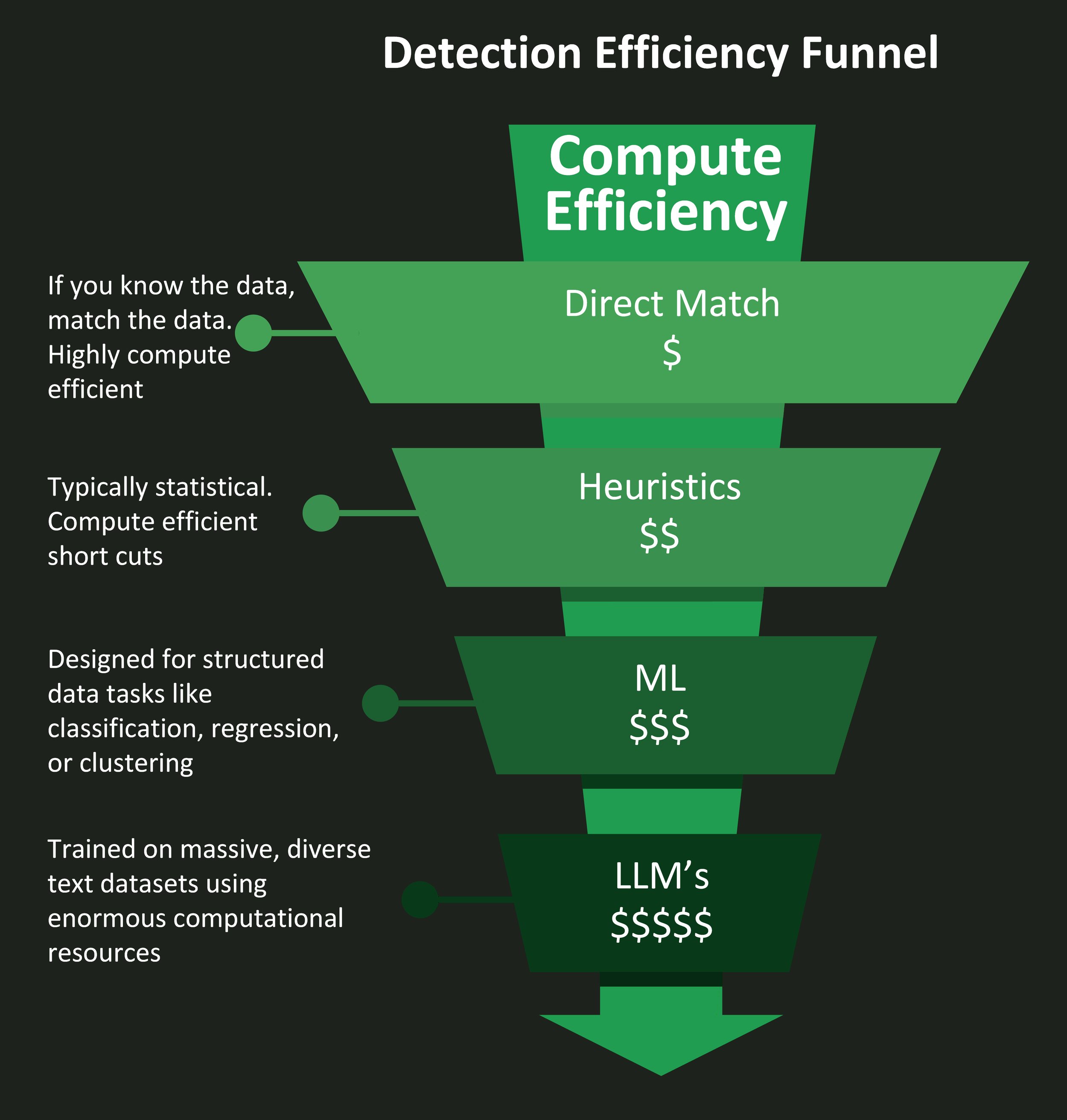 If you can detect with a simple match, then do it. For example, our library fully maintains every Sigma Rule which is peer reviewed by experts, accurate, and cost effective. As you move down the funnel, we then balance accuracy and costs to provide the most efficient detection that scales at an affordable price.
