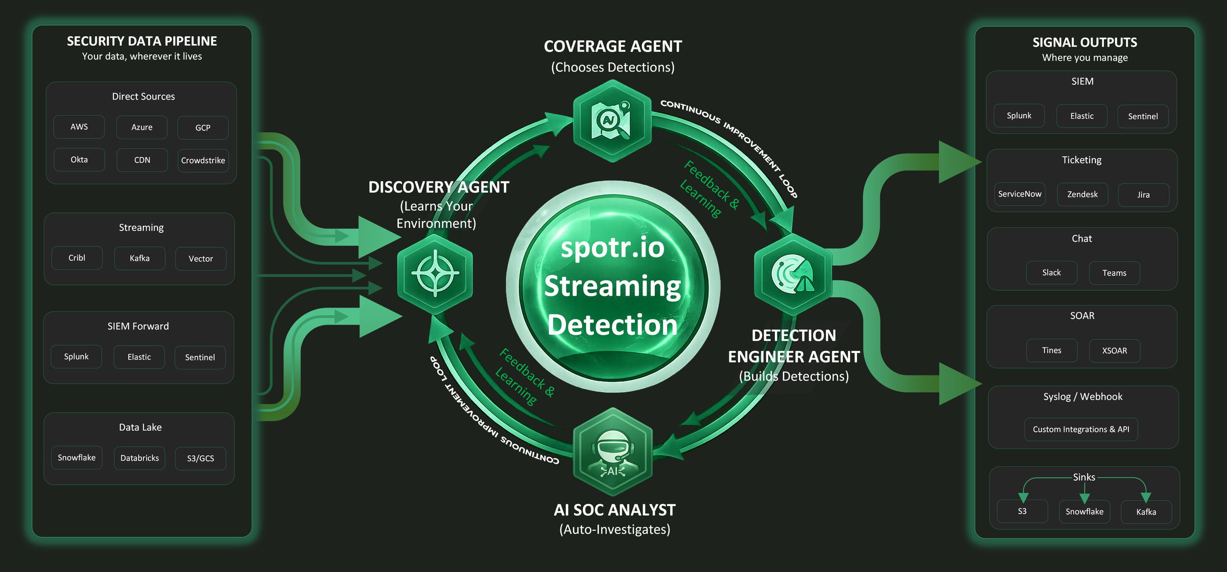Detections are only as good as what happens next. spotr.io routes enriched signals to your entire stack — ticketing, SIEM, SOAR, and data lakes — the instant a threat is confirmed. No batch jobs. No waiting.