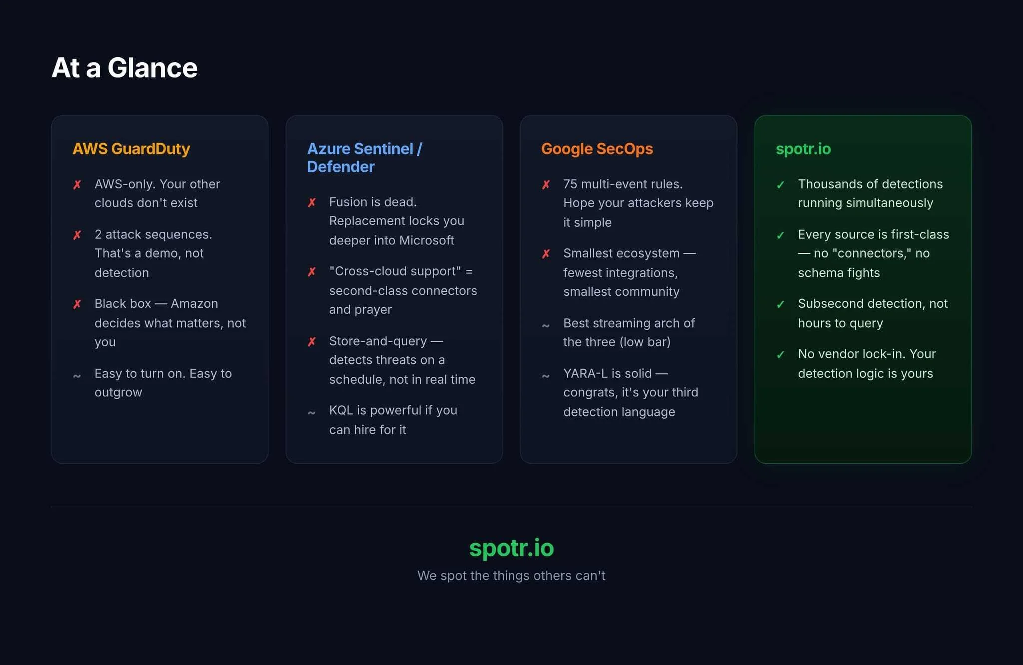 spotr.io treats every data source as first-class. AWS CloudTrail, Azure Activity Logs, GCP Audit Logs, on-prem syslog — all normalized on stream, enriched in flight, and evaluated against thousands of concurrent detections sub second. No 75-rule cap. No cross-cloud schema headaches. No trusting one cloud vendor's security tool with a competitor's data.