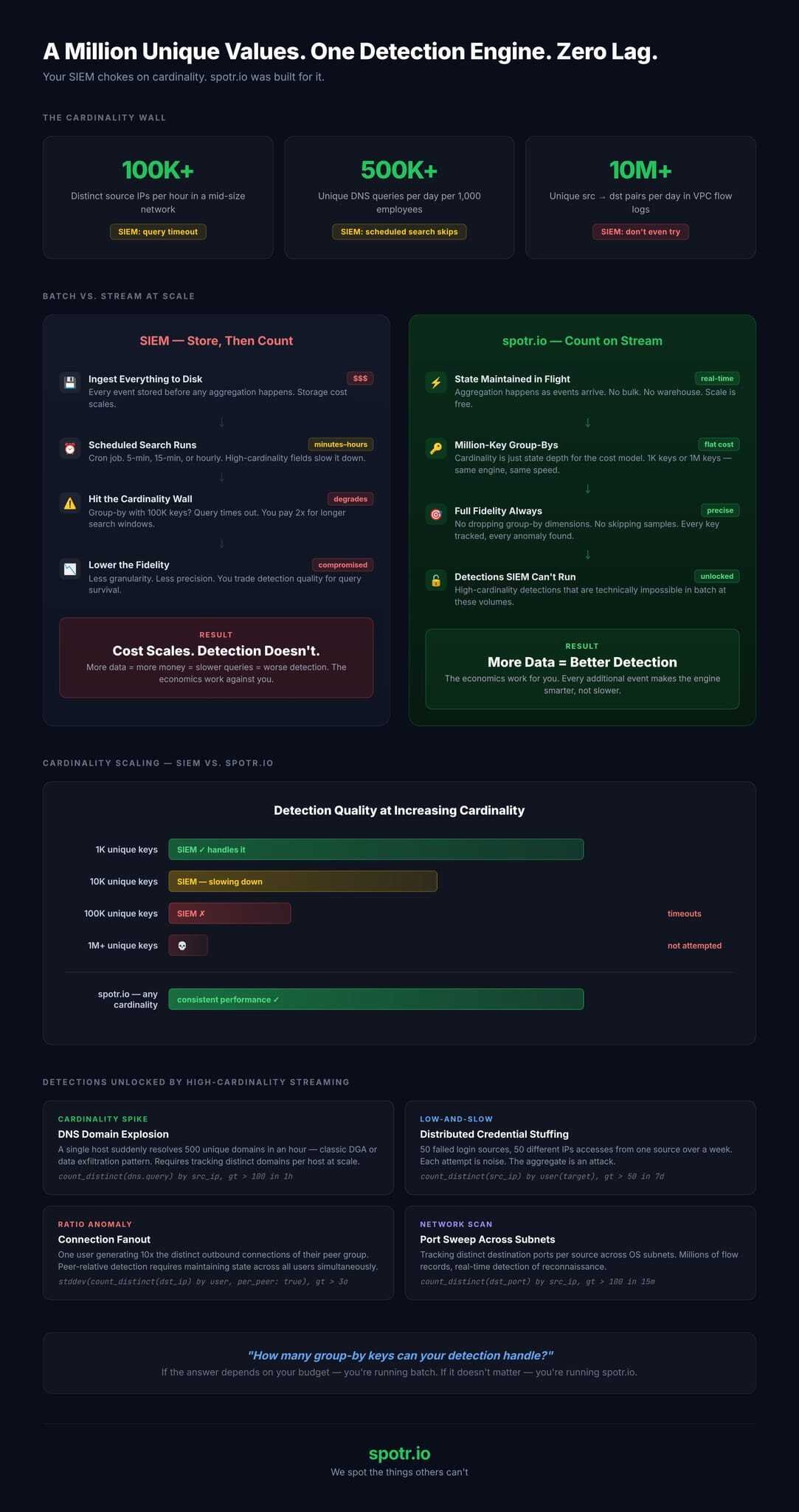 Your SIEM chokes on cardinality. Count distinct users per source IP? Fine at 100. At 100,000? The query times out, the cost explodes, or the search just... doesn't run. So you do what everyone does — you lower the fidelity. Fewer group-bys, wider time windows, less granularity. You trade detection quality for query survival.