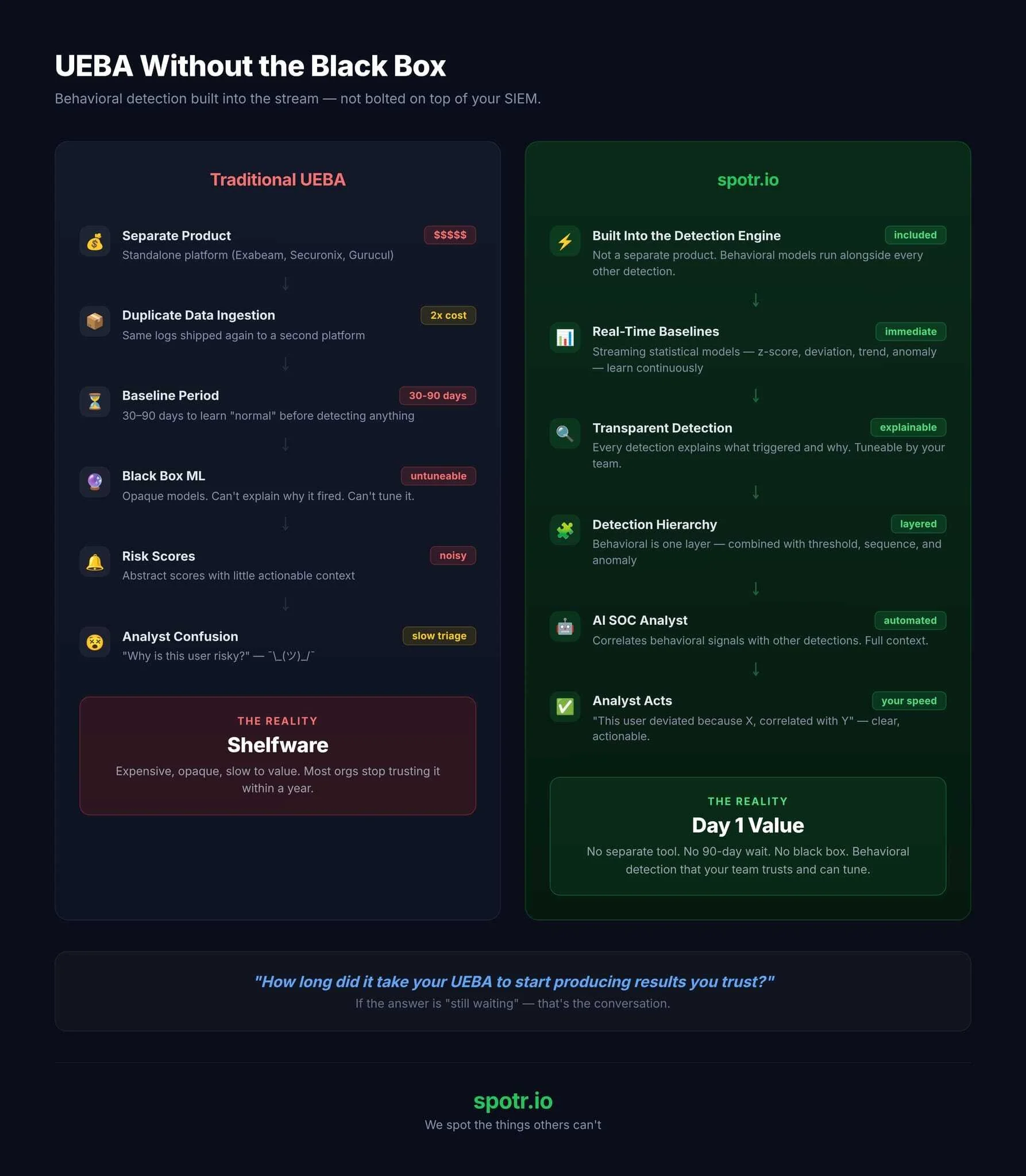 Traditional UEBA (User and Entity Behavior Analytics) (Exabeam, Securonix, Gurucul) is a separate product bolted onto your stack. You ship the same logs to a second platform, wait 30-90 days for baselines to build, then get opaque risk scores from a black box ML model that nobody can explain or tune. Most orgs stop trusting it within a year. It becomes shelfware.