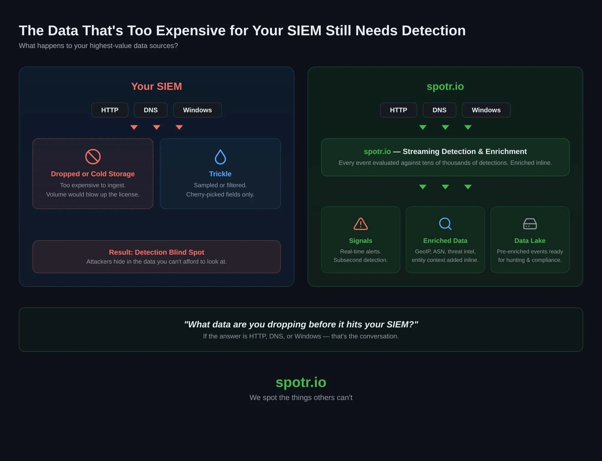 "What data are you dropping before it hits your SIEM?" If the answer is HTTP, DNS, or Windows — that's the conversation.