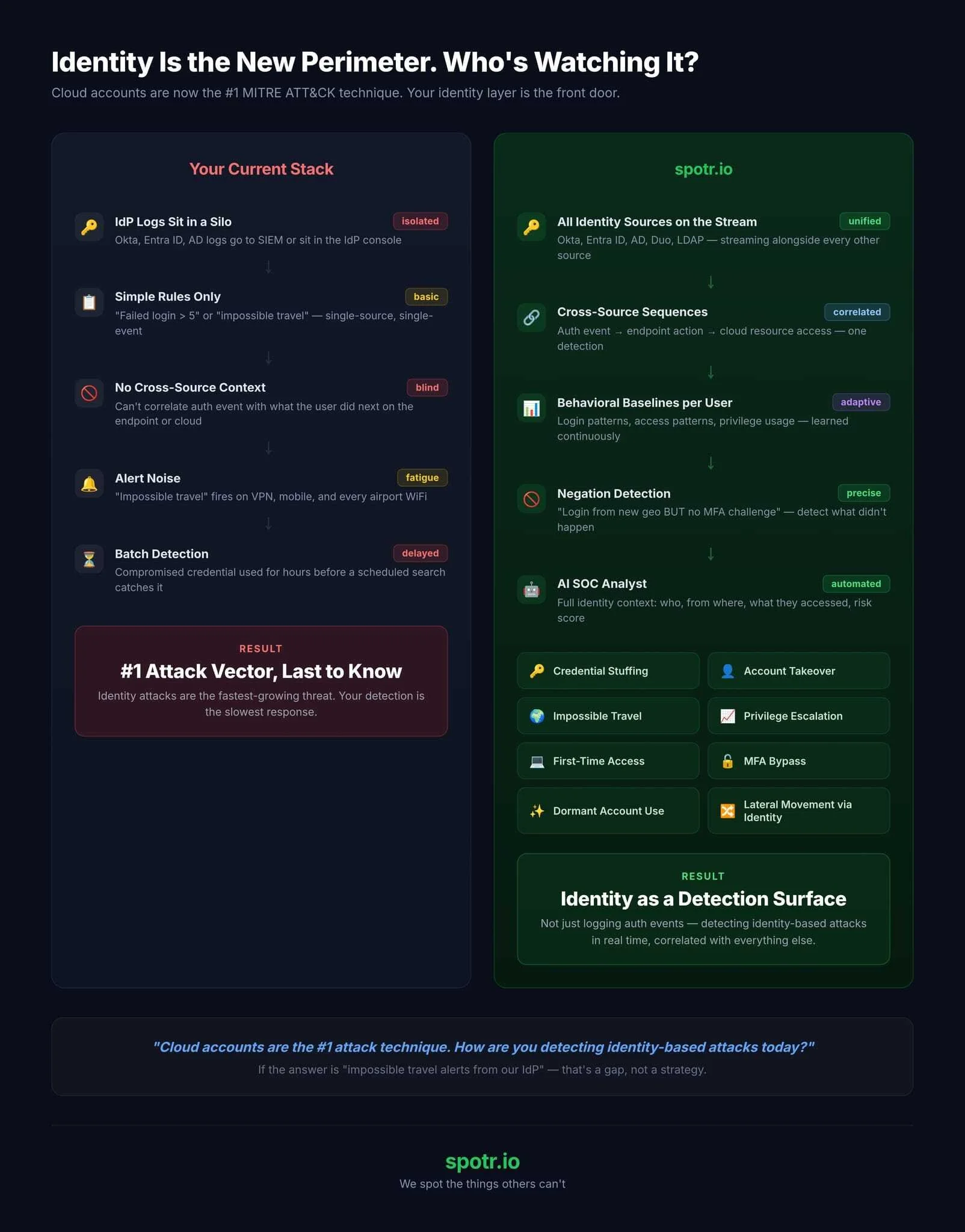 "What if every identity event was correlated with everything else, in real time, with behavioral baselines?" — That's spotr.io.