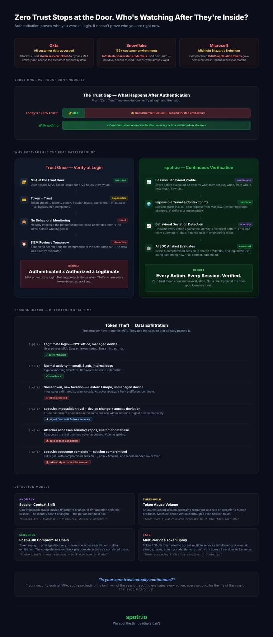 The Okta breach — attackers used stolen session tokens to bypass MFA entirely. The Microsoft Midnight Blizzard attack — compromised OAuth tokens gave persistent access across tenants. Snowflake — stolen credentials from infostealer malware used to exfiltrate data from 165+ customer environments. In every case, authentication was "passed." The post-auth behavior was where the attack lived.