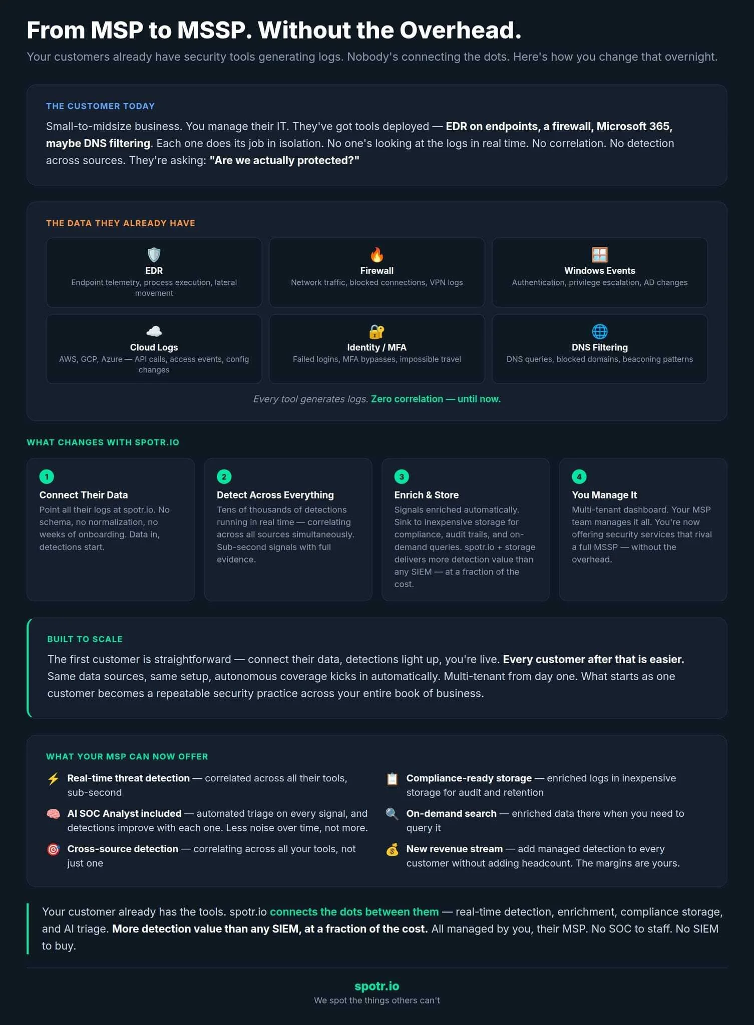 MSPs manage IT — they deploy tools, keep the lights on. But nobody's correlating the logs, watching for lateral movement at 2 AM, or detecting credential abuse across sources. Their customer asks "Are we actually secure?" and the MSP doesn't have a good answer.