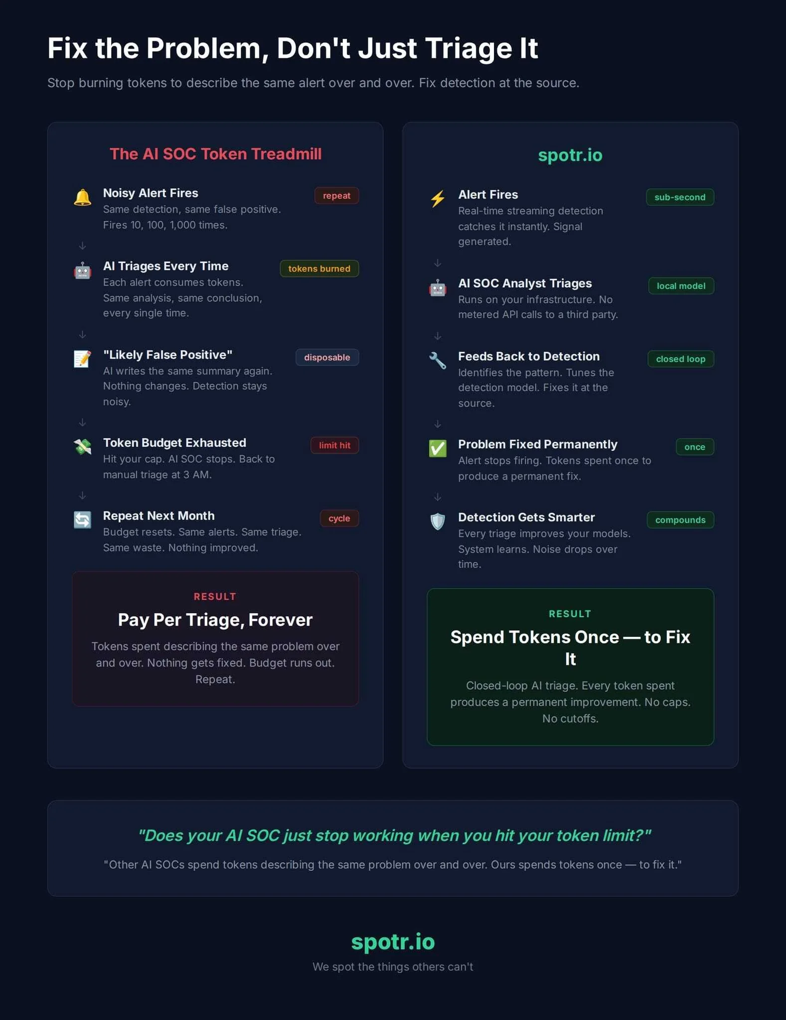 Third-party AI SOC tools burn tokens triaging the same alerts over and over. Noisy detection? The AI writes the same "likely false positive" summary every time it fires — 10 times, 100 times, 1,000 times. Same problem. Same tokens. Same conclusion. Nothing changes.