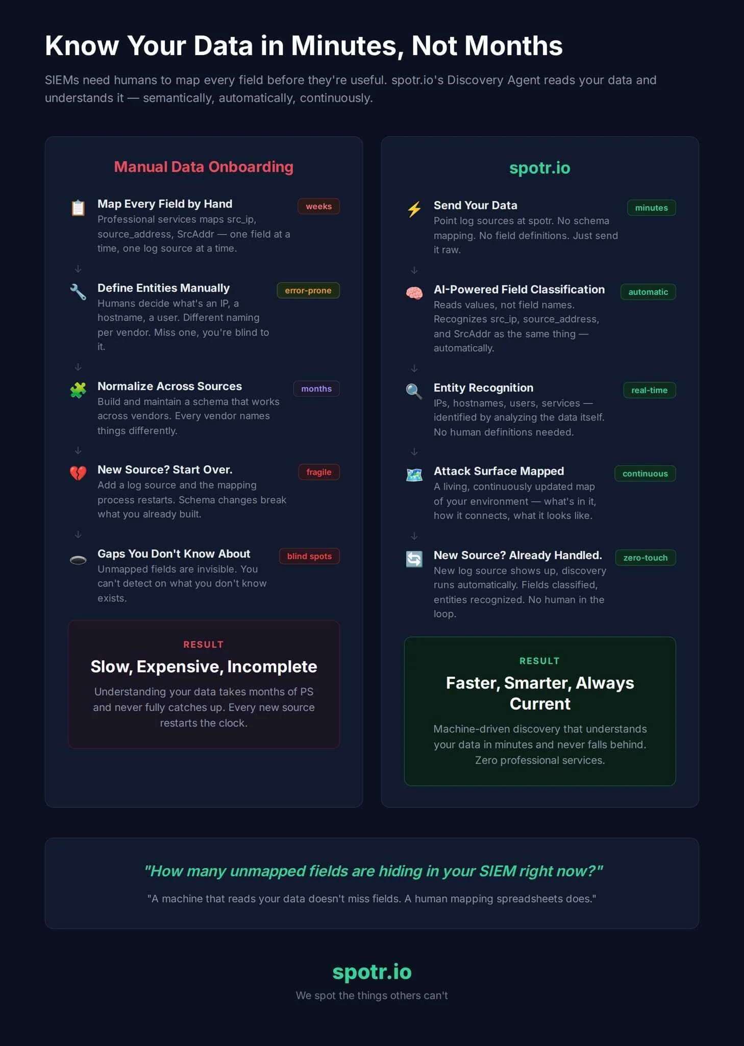 spotr.io's Discovery Agent uses AI-powered entity recognition to understand your data by reading it — not by reading field names. It doesn't care whether your firewall calls it src_ip, your cloud provider calls it source_address, or your EDR calls it SrcAddr. It looks at the values and knows what they are.