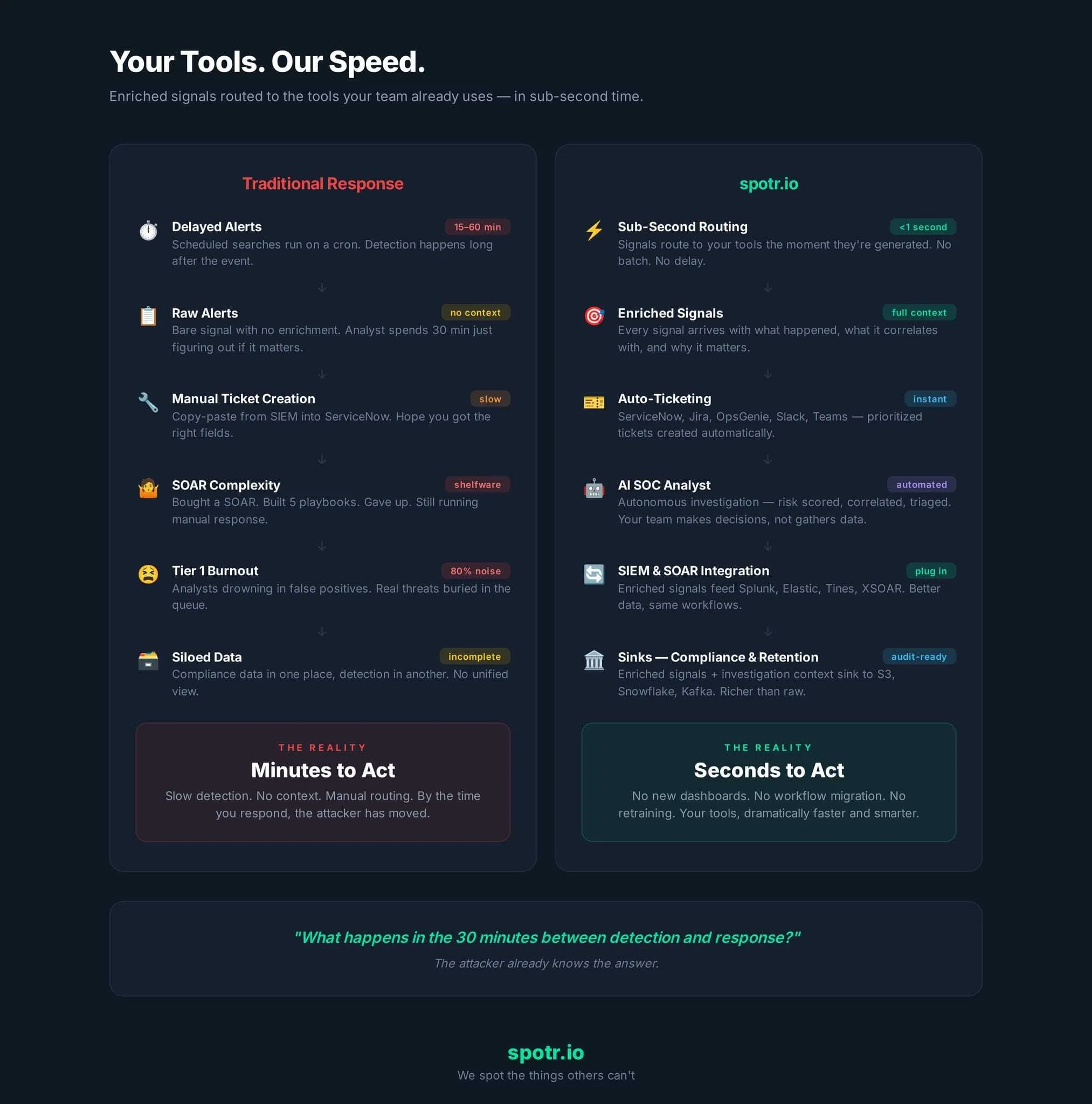 spotr.io pushes enriched, investigated signals directly into your existing operational workflow — in sub-second time. Every signal arrives with full context: what happened, what it correlates with, why it matters, and what to do about it.