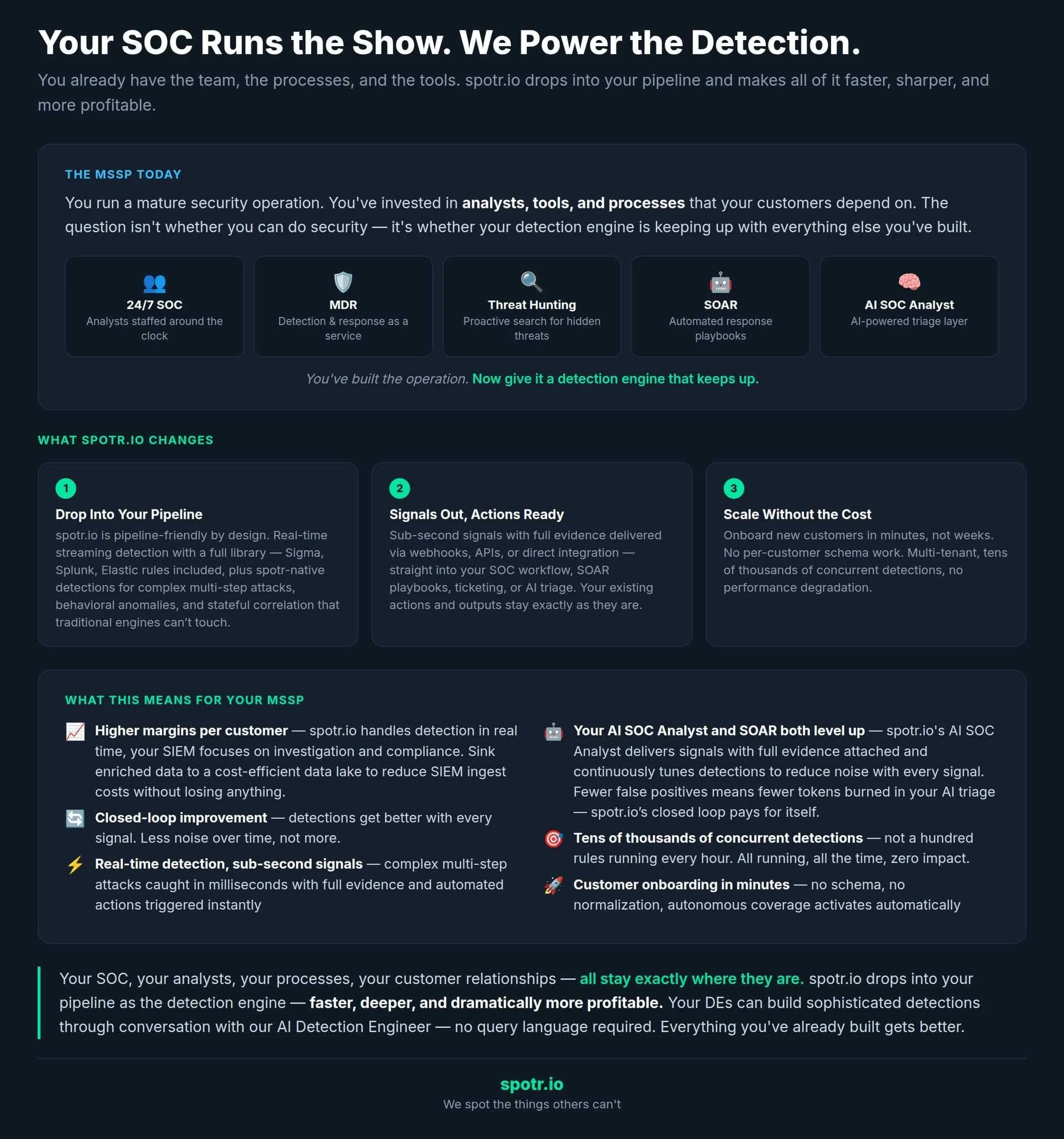 MSSPs are in a margin fight. Everyone runs the same stack — same SIEM, same rules, same SLA. SIEM costs scale with data, analyst costs scale with alerts, and both keep going up. You're competing on price, not capability.