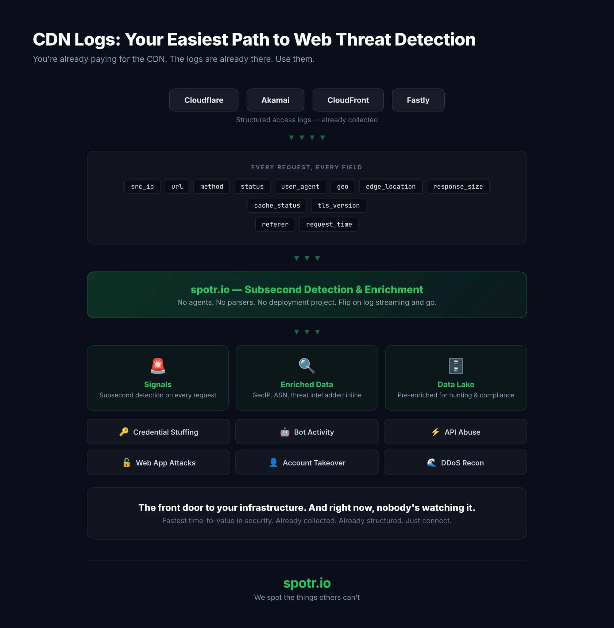 spotr.io takes CDN logs directly off the stream. No agents, no new infrastructure, no parser project. Flip on log streaming, point it at spotr.io — sub-second detection, enriched inline, sunk to your data lake ready for hunting.