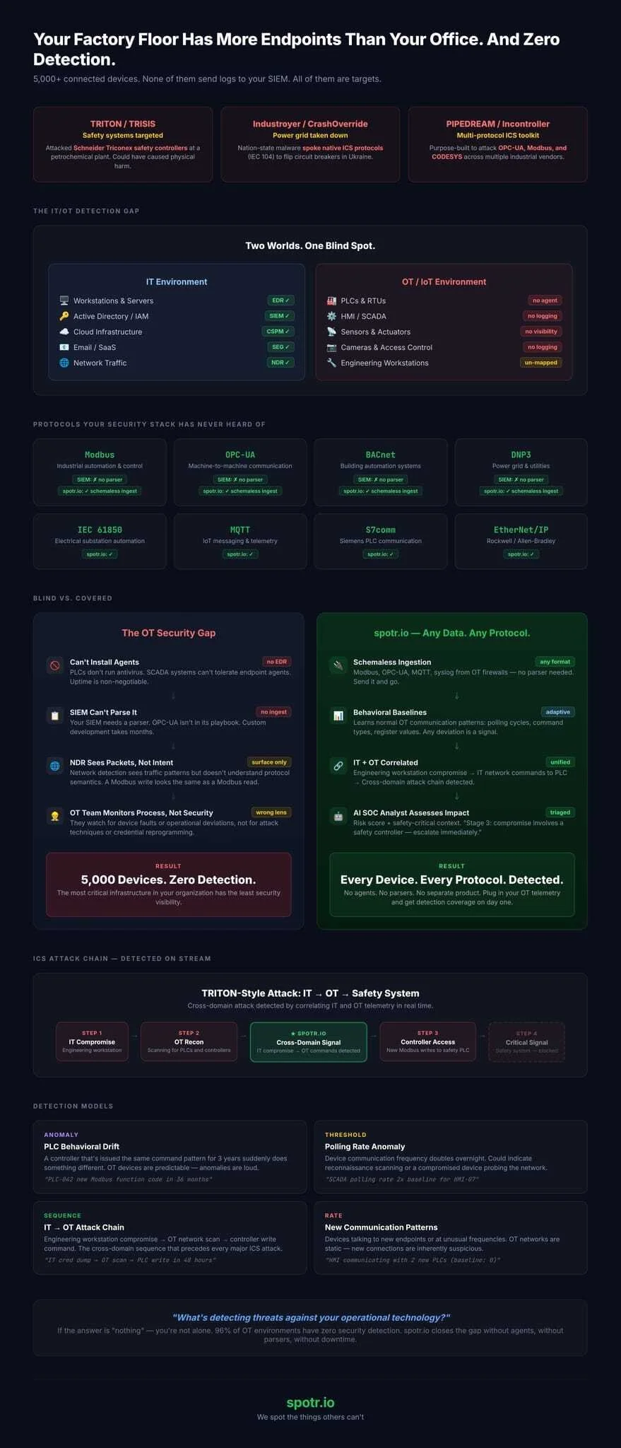The average manufacturing plant runs 5,000+ connected devices — PLCs, HMIs, SCADA systems, sensors, cameras, badge readers. Critical infrastructure runs 10x that. None of it sends logs to your SIEM. Most of it can't run an agent. It speaks Modbus, BACnet, DNP3, OPC-UA — protocols your security stack has never heard of.
